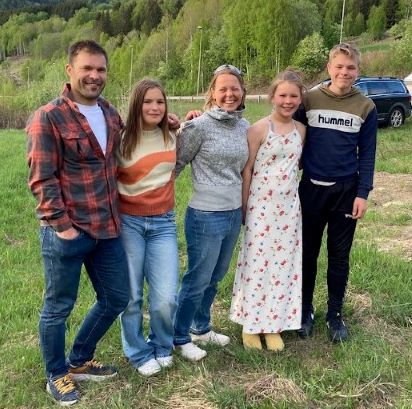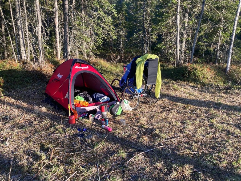 Like før Ringebu gav jeg meg for dagen og fant en fin plass mellom E6 og Gudbrandsdalslågen. Nye 60 km var løpt. Mens jeg slo opp teltet kom plutselig en bil inn på jordet hvor jeg holdt på. Det var Cathrine og Jon Bjarne Onsøien med barn og hunder på vei til konfirmasjon i Trøndelag. De er formann i henholdsvis Paragruppa og Skigruppa i Gjerpen IF, der jeg selv er formann i Friidrettsgruppa. De hadde peilet meg inn via trackeren jeg hadde på vogna. Veldig koselig besøk. Av ungene fikk jeg en stor pose seigmenn 🙂