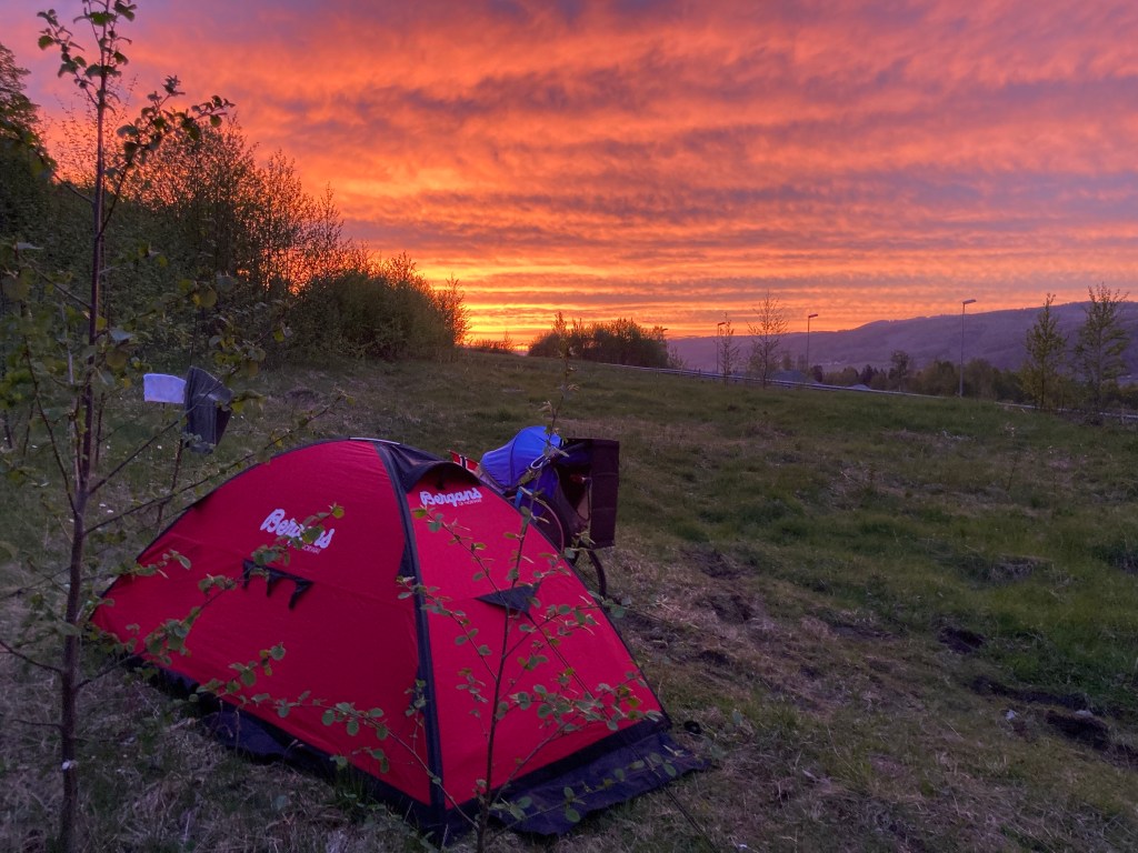 Onsdag 18.mai var jeg tilbake på Jevnaker etter begravelse og 17.mai. Kort tid etter start ble jeg tatt igjen av ei jente som var på vei til Nordkapp. Karina fra Hvittingfoss. Det ble den første i en lang rekke syklister som skulle enten nordover eller sørover. Fra Brandbu valgte jeg å følge ruta til Simon Holvik over heia til Einasjøen. I ettertid burde jeg kanskje ha kikket litt mer på kartet. Jeg havnet på en 1-2 mil lang grusvei gjennom villmarka. Det ble unødig tungt i et bakkete terreng og litt blaute skogsveier. Belønningen var en nydelig villcamp der storfuglene spilte mye av natten. Det ble en kort dag, kun 39 km. Dagen etter kom jeg omsider ned på asfalten på vestsiden av Einasjøen og da ble det ganske slett og lettløpt nedover til Gjøvik. Videre nordover mot Lillehammer var helgetrafikken på vestsiden av Mjøsa formidabel og ikke helt ufarlig for en løper med vogn. På enkelte strekk ble jeg tvunget ut på en smal skulder på hovedveien. Det ble en farlig kort avstand fra vognas “støtfanger” til bilenes støtfangere. Her gjelder det å være på vakt! Dagen, etter 62 km, ble avsluttet med en fantastisk solnedgang like overfor veien litt sør for Biri.