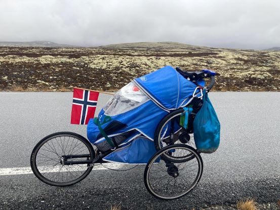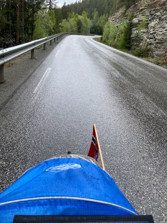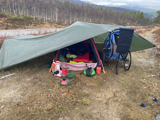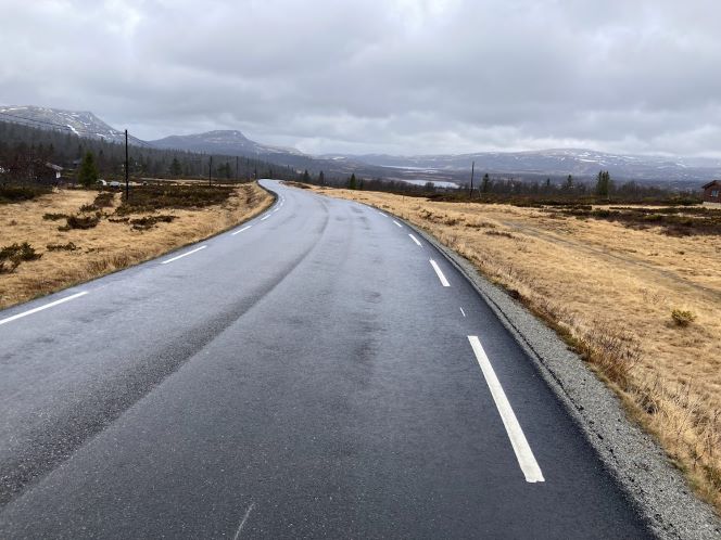 Jeg kjente nå at powernappen på bensinstasjonen hadde gjort underverker. Jeg støtet på oppover, bakkene ble brattere og brattere og tok aldri slutt. Passerte Venabu på vei opp. Der ligger Venabu kirke. Er ikke religiøs, men veldig glad i kirkebygg som må fotograferes. Et godt stykke ut på dagen var jeg helt oppe og det flatet ut. En utrolig god følelse av mestring der jeg jobbet bak den forholdsmessige tunge vognen min. Vel oppe fikk jeg fart på beina og langet ut. Nå gikk kilometerene fort i til dels lettløpt terreng. Utsikten var fantastisk, men nettopp den berømte utsikten mot 2000 meters toppene i Rondane så jeg lite til. Rundt hele massivet var der et tykt skydekke. Etter nye 60 km og 1120 høydemeter sa jeg takk for meg og campet 5-6 m fra veien. Der var heldigvis veldig lite trafikk.