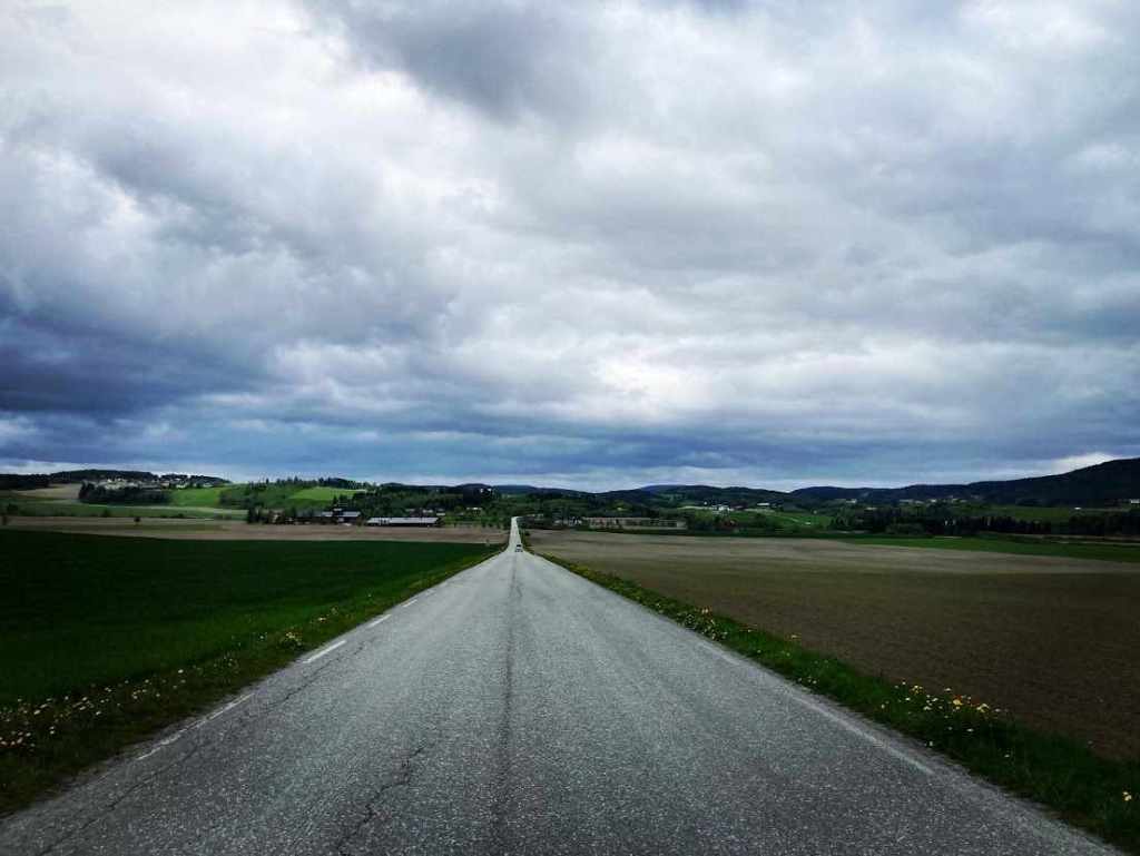 Ved Ler tar jeg skarpt til høyre, bort fra E6. For 2.gang gjør jeg tabben med slavisk å følge Simen Holviks spor. Han løp uten vogn. De neste to dager ble tunge med masse smale og kuperte veier. Min eneste lille nedgangsperiode fikk jeg disse dagene. Det gikk tungt med beina og enda tyngre i hode. Motivasjonen sank som en sten. Det gikk seint. Regnet begynte å hølje ned da jeg nærmet meg Stjørdal. Regnbuksa var borte når jeg trengte den som mest. Våt og kald jobbet jeg meg frem mot Stjørdal. Jeg måtte få tak i en ny regnbukse. Og da ble det turens første innendørs overnatting i samme slengen. Det var godt å komme i hus og få vasket både meg selv og klær. Og ligge i en god seng igjen 🙂