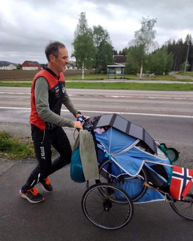 Veien videre nedover Driva og E6 passerte jeg Oppdal og etter hvert var jeg nede i lavlandet igjen. En melding tikket inn på mobilen. Det var Ivan Persson. Han og følgebil var på vei nordover til Nordkapp. Der skulle løpeturen hans sydover mot Lindesnes starte. Vi hadde en fin halvtime langs med veien. Ivan er en humørfyllt kar og stemningen var høy. Nå gikk desverre den løpeturen sydover i stå ganske fort da Ivan fikk problemer med kroppen allerede etter 2-3 dager. Synd, men Ivan kommer tilbake!
