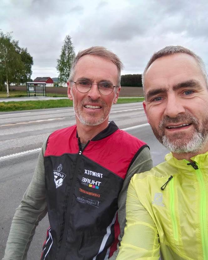 I Levanger møtte jeg Espen Valseth som hadde tatt kontakt noen dager før. Vi fikk en nydelig og trivelig løpetur sammen opp mot Verdal. Han var formann i Verdal Friidrett og jeg i Gjerpen Friidrett, så vi fikk mye å snakke om. Han trente for sub2:40 så jeg måtte gi på litt så vi fikk noe ut av det.