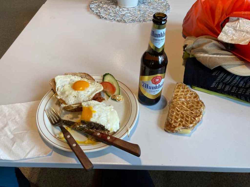 På Sparbu bare måtte jeg innom Shell for å få tak i noen av de gode vaflene de lagde. Feite vafler med smør og brunost viste seg og være utmerket løpemat. Da mannen som drev stasjonen fikk nyss i jeg skulle til Nordkapp fikk jeg med meg ei god niste derfra (gratis!). Så kom kona innom, hun drev Sparbu Kro like ved siden. Før jeg viste ord av det satt jeg på kafeen med fri lunsj. Kan anbefales! God og mett måtte jeg ta i litt etterpå for å klare å løpe.