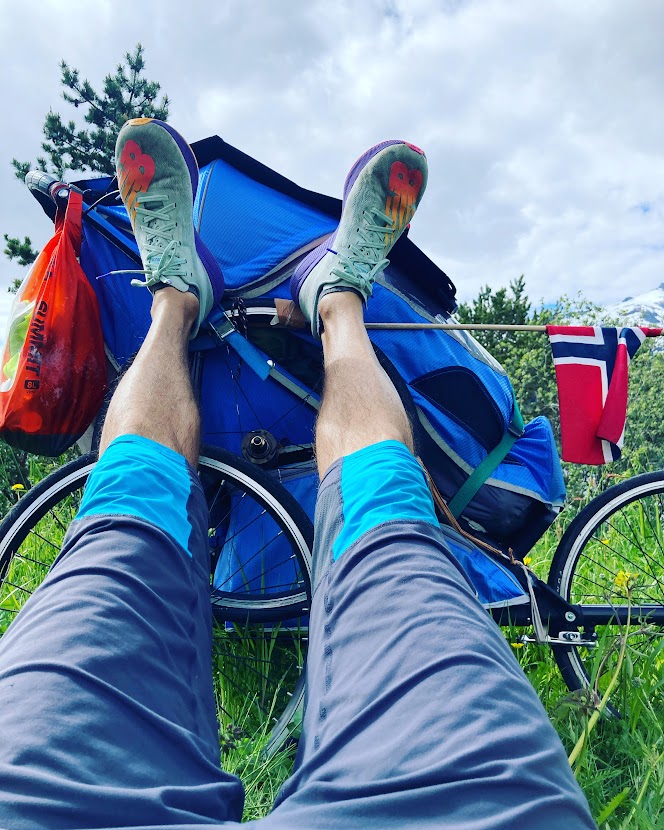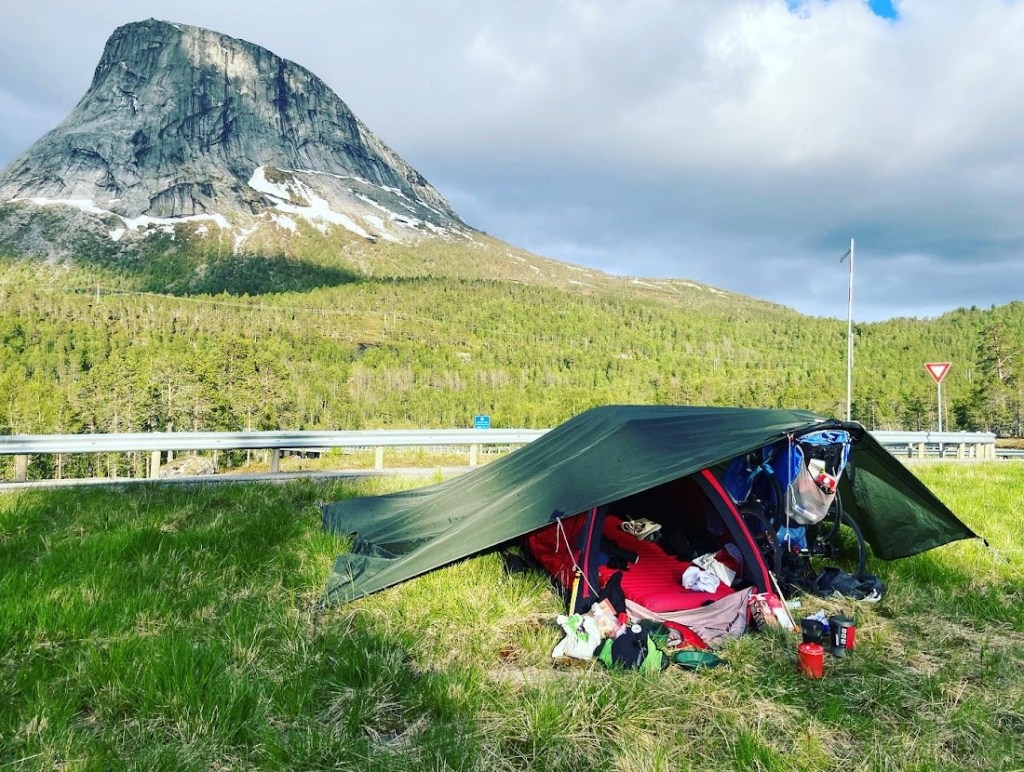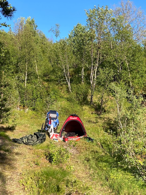Ferden gikk videre nordover E6 i Nordland. Vakker og vill natur. Mulighet for villcamp nær sagt hvor som helst. Været var igjen på min side. Det gikk jevnt i +/- 60 km/dag som var det jeg håpet på før start. Da var det viktig å løpe seint og jevnt. Gå alle bakke, dvs være tolmodig så når jeg målet. Et par ganger om dagen la jeg meg til utenfor veien og kvilte beina. Rett og slett en powernapp for beina. Og av og til sovnet jeg og. Til og med vogna fikk godt stell og påfyll når det trenges:-)