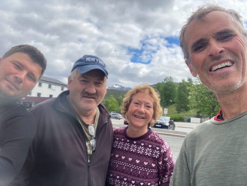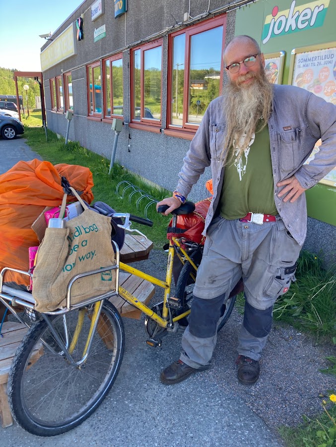 På vei ned mot ferjen som trafikkerer Bognes-Skarberget traff jeg på en skikkelig “tramp”. McWitty fra London. På en evig ferd rundt i verden der han besøker og dokumenterer alle gravsteder der engelske soldater ligger begravd. Og det er mange plasser. Han har ikke den nyeste sykkel på markedet. Utrolig humør på den mannen. Sover nær sagt alle plasser det går an, så lenge den er “free and wild”. Dagen etter presterte han å krasje da bremsene sviktet i en nedoverbakke. Bilder jeg fikk fra sykehuset viste en forslått mann som nå måtte gjør retur til London (et par måneder senere var han ute på veien igjen)