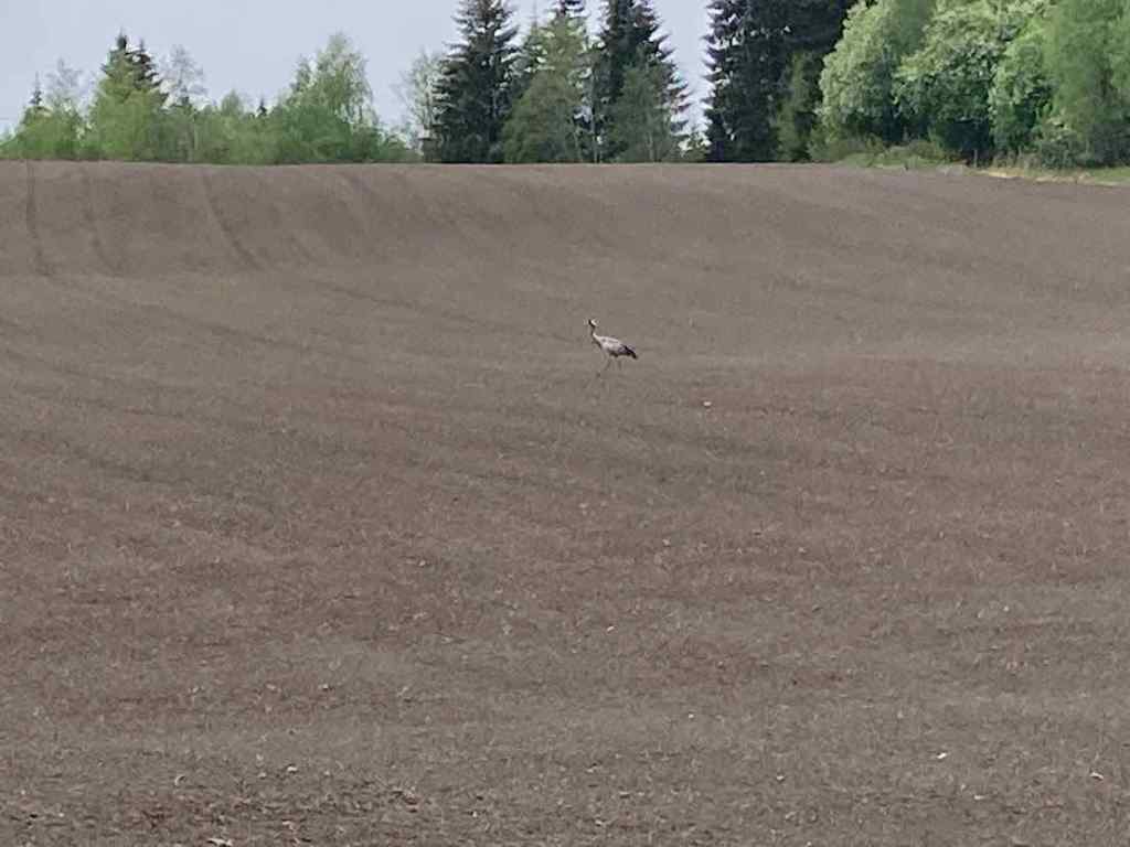 ,Krysset Kjerringstrømmen over broa ved Efjord. Langt mellom toaletter når en bruker 2.5 time på 15 km. Heldigvis mye skog langs med veien. Ute på et jorde stod en enslig trane. Så faktisk en del oppover Norge.